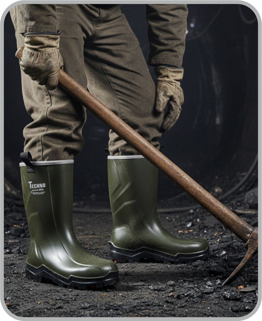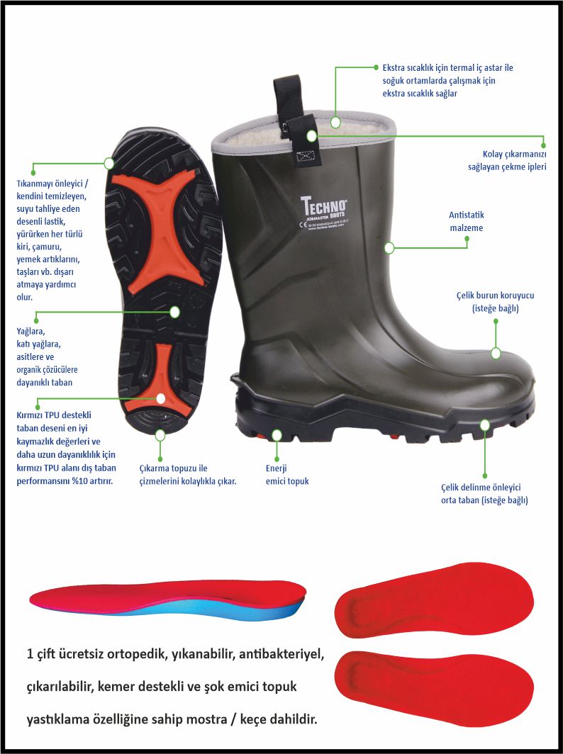Techno Boots çizmeleri, poliüretan hammaddesi kullanılarak üretilmiştir. Poliüretan size uzun süreli konfor sağlar.